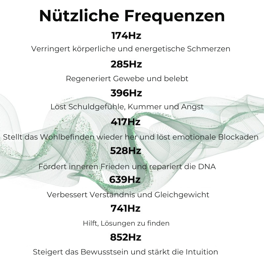 Die Frequenzen sind sehr kraftvoll. Hören Sie nicht länger als 20 Minuten am Stück eine Frequenz an, Sie können sie aber mehrmals täglich verwenden. Hören Sie außerdem nicht bei hoher Lautstärke. Dies gilt nicht, wenn das Gerät ohne Ton verwendet wird.